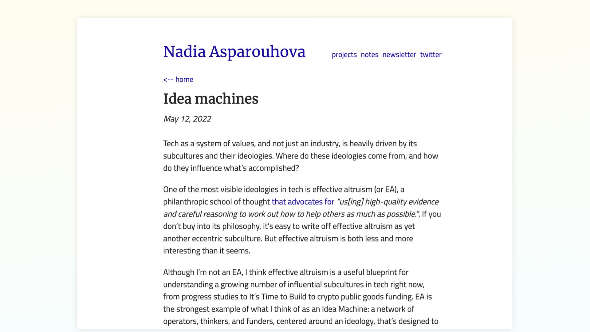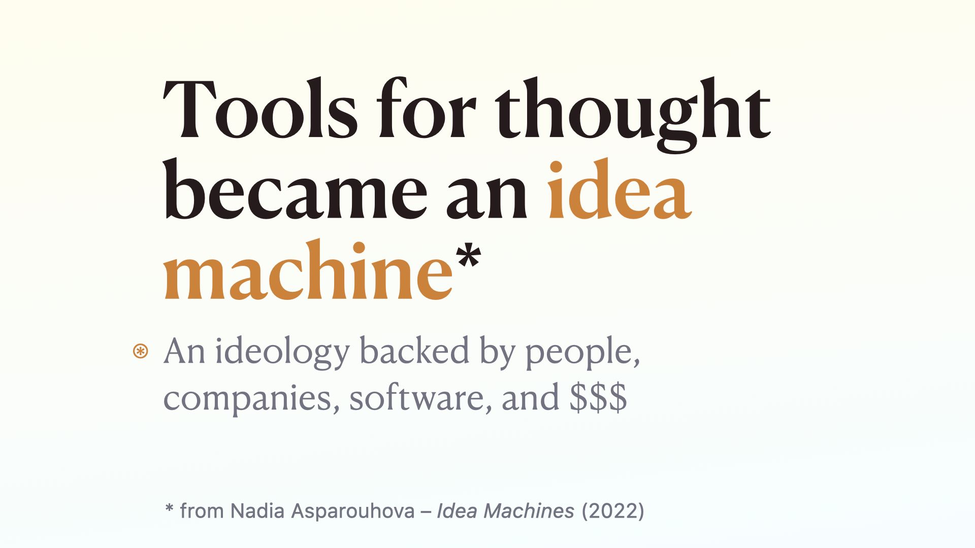 Essentially, Tools for thought became an idea machine Idea machines are a concept Nadia Asparouhova coined in an essay in 2022.