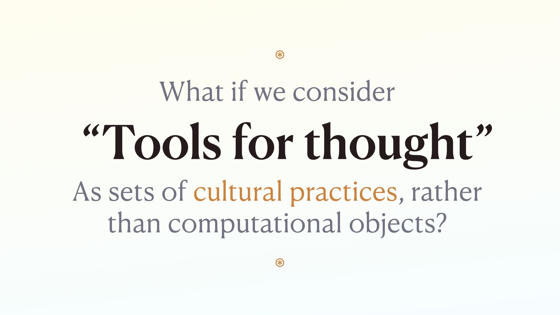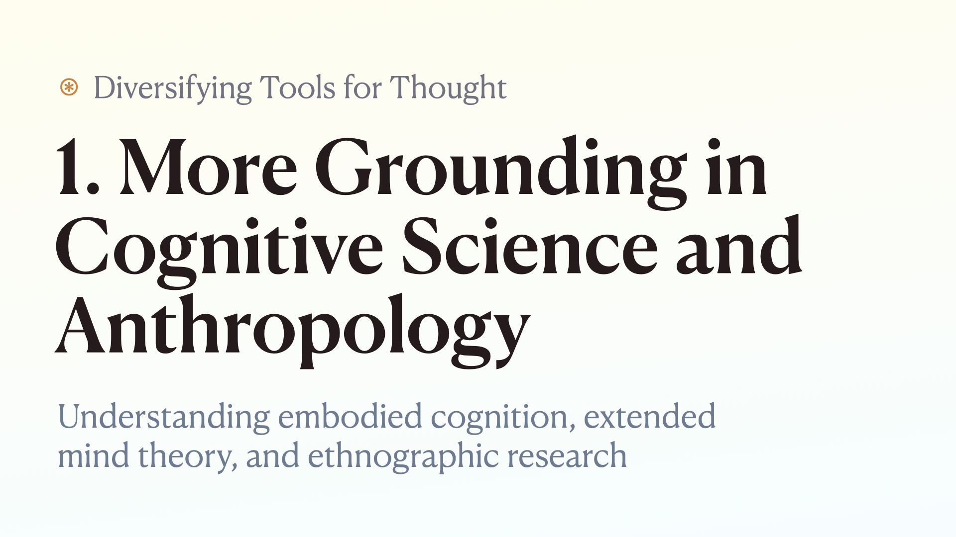Specifically, theories like embodied cognition, extended mind theory, and looking at examples of cross-cultural ways of thinking from ethnographic research could add a lot to our conception of tools for thought.