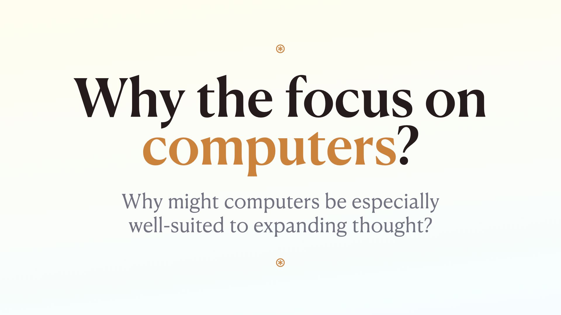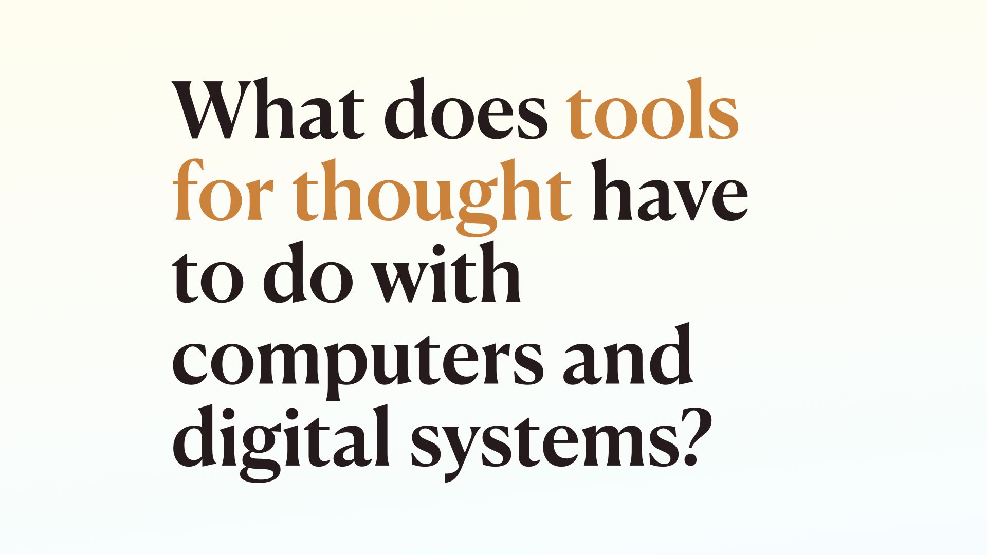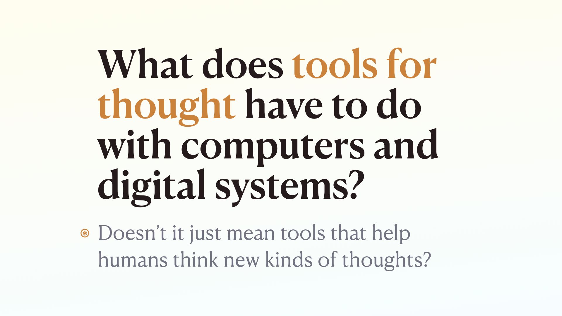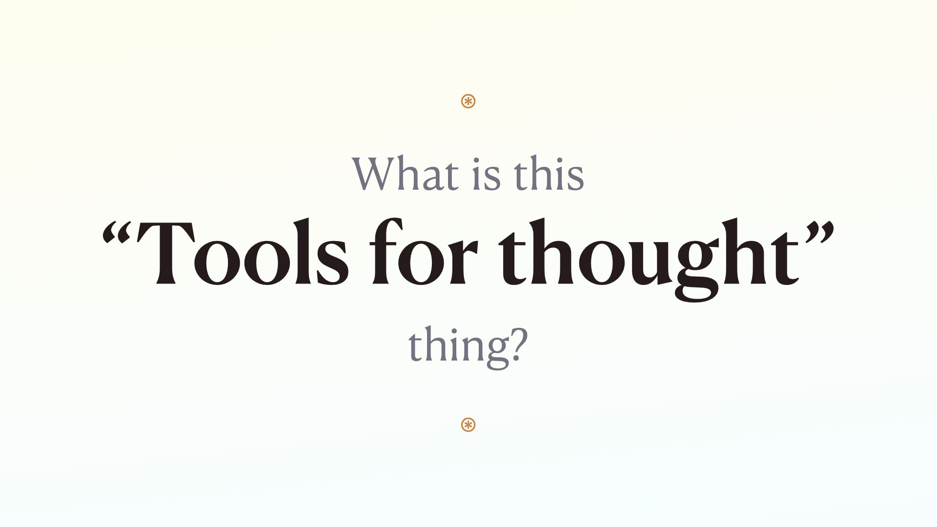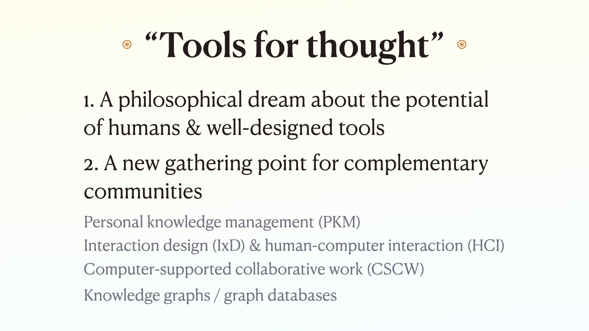 Considering this is a lecture series on tools for augmented thinking and you are mostly MIT people, I’m going to be talking to you as potential creators of tools for thought, even if you don’t know much about this specific phrase yet. I’ll get into it’s meaning and history in a minute.