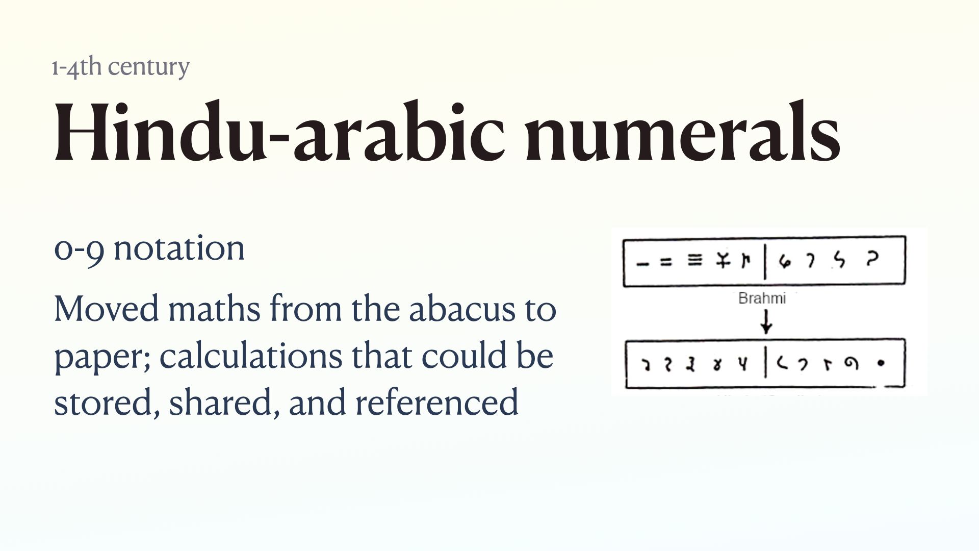 Hindu-arabic numerals made accounting and record keeping possible. Calculations could be stored, shared, and referenced Enabled all bureaucracy since.