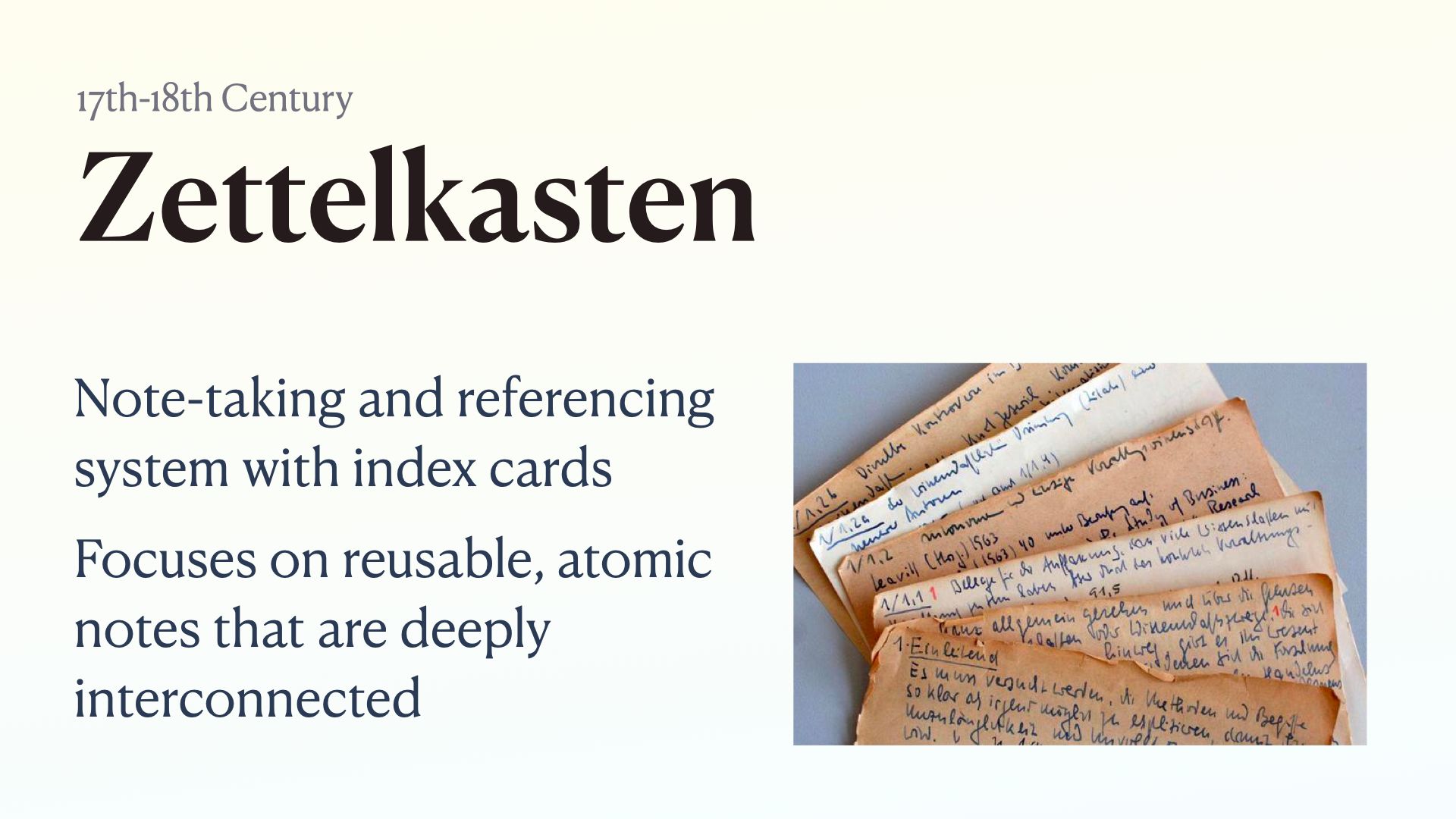 Zettelkasten (slip box) A technique from around the 18th century where you write atomic notes on individual index cards and keep them all in a large box or “slip box”. You assign each card an ID, and use those to link cards together to create deeply interconnected ideas.