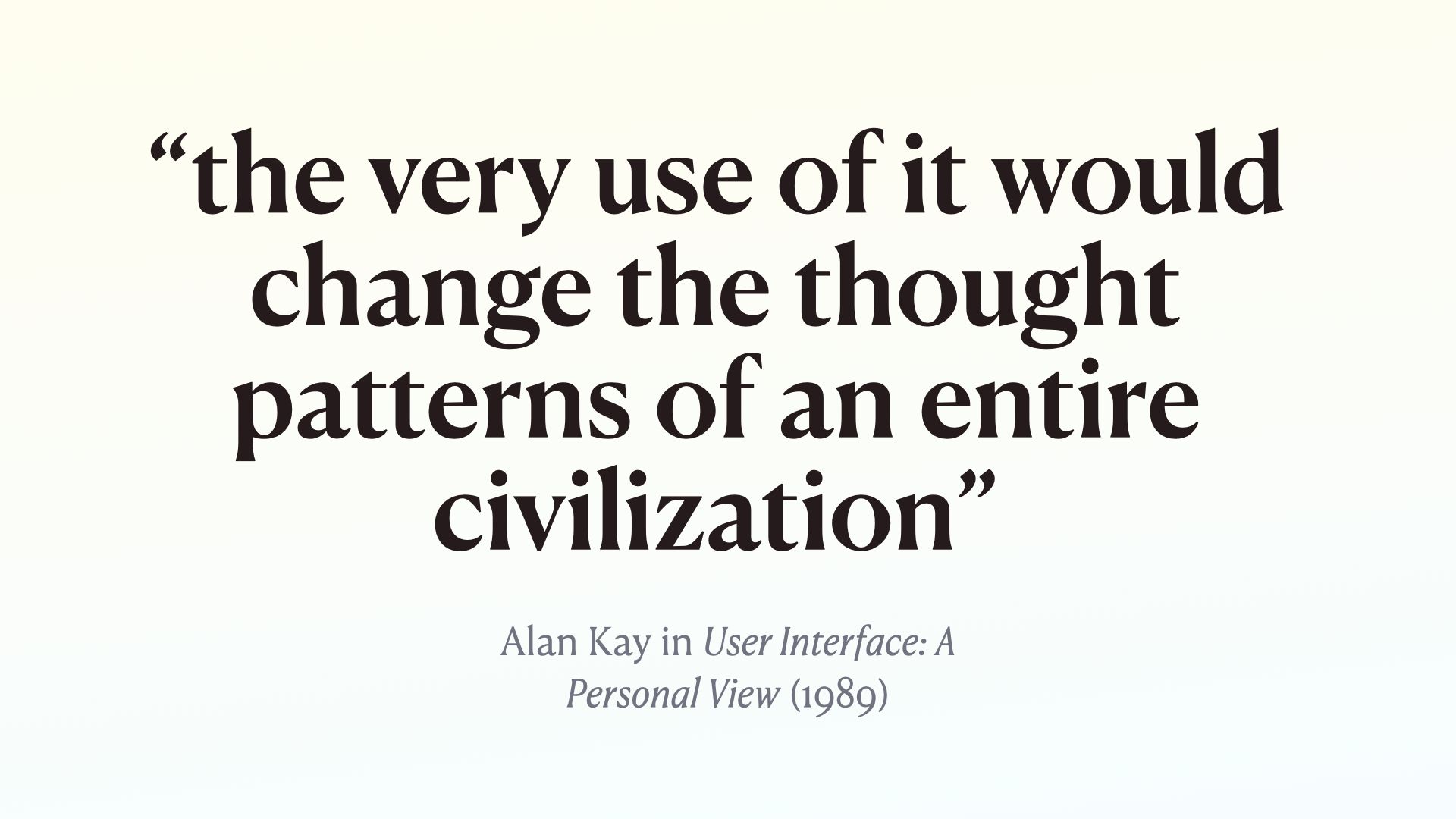 Alan Kay picked up a lot of this Philosophy and applied it while developing the foundations of most of our current computing environments at Xerox PARC Wrote a paper called “User Interface: A Personal View” in 1989 where he talked about his vision of the potential of computational mediums