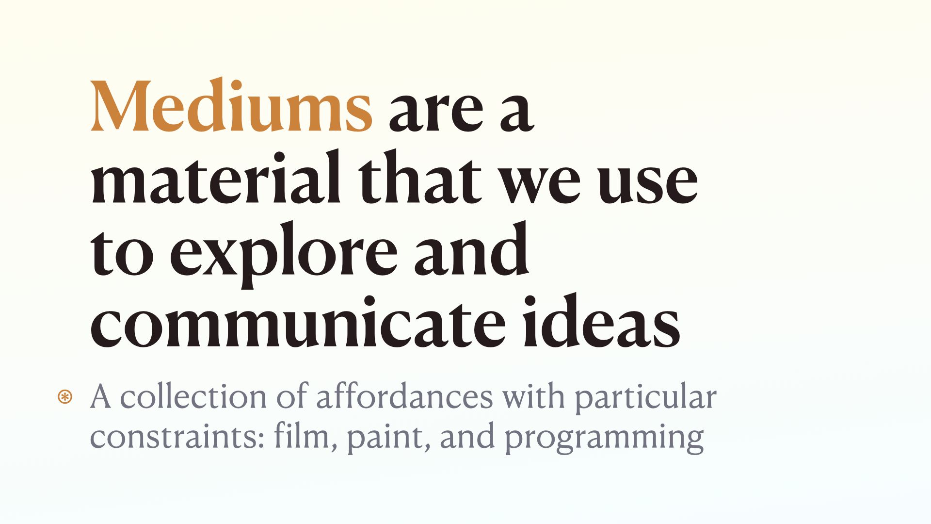 Mediums are a material we use to communicate ideas: film, painting, writing, photography