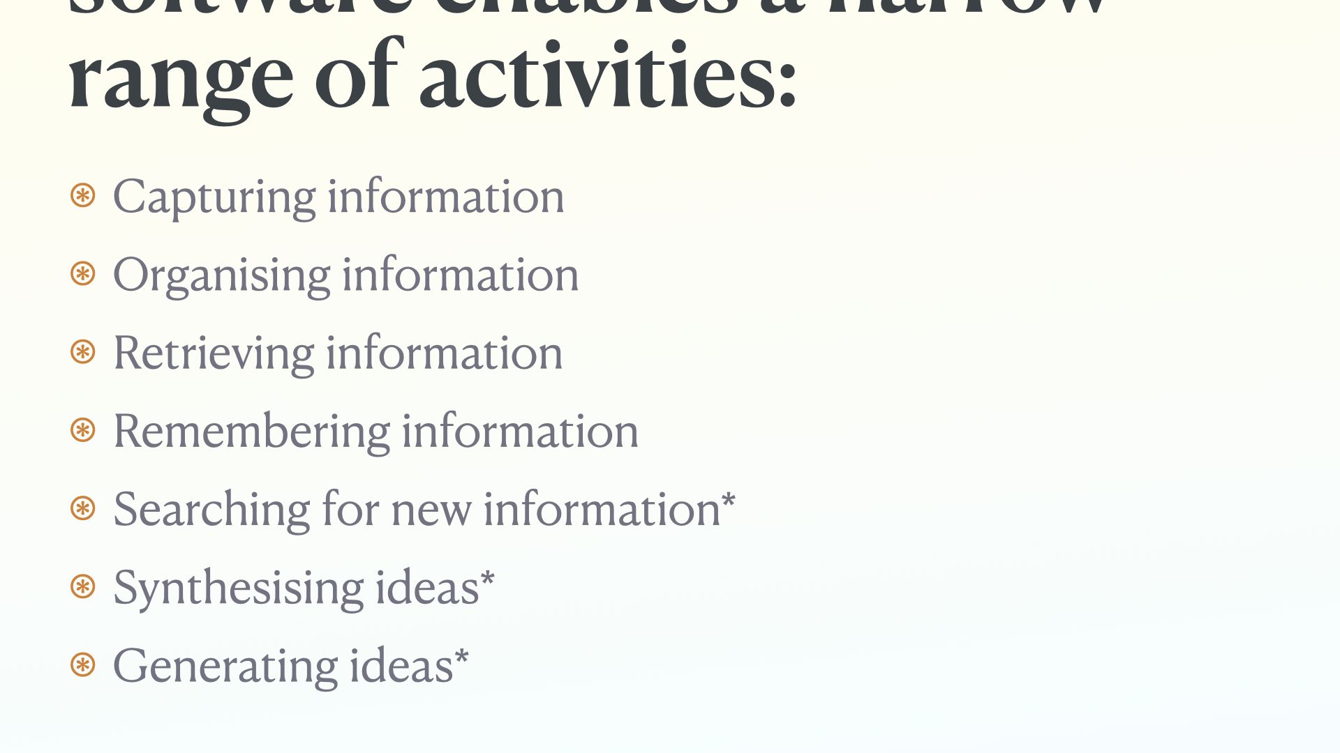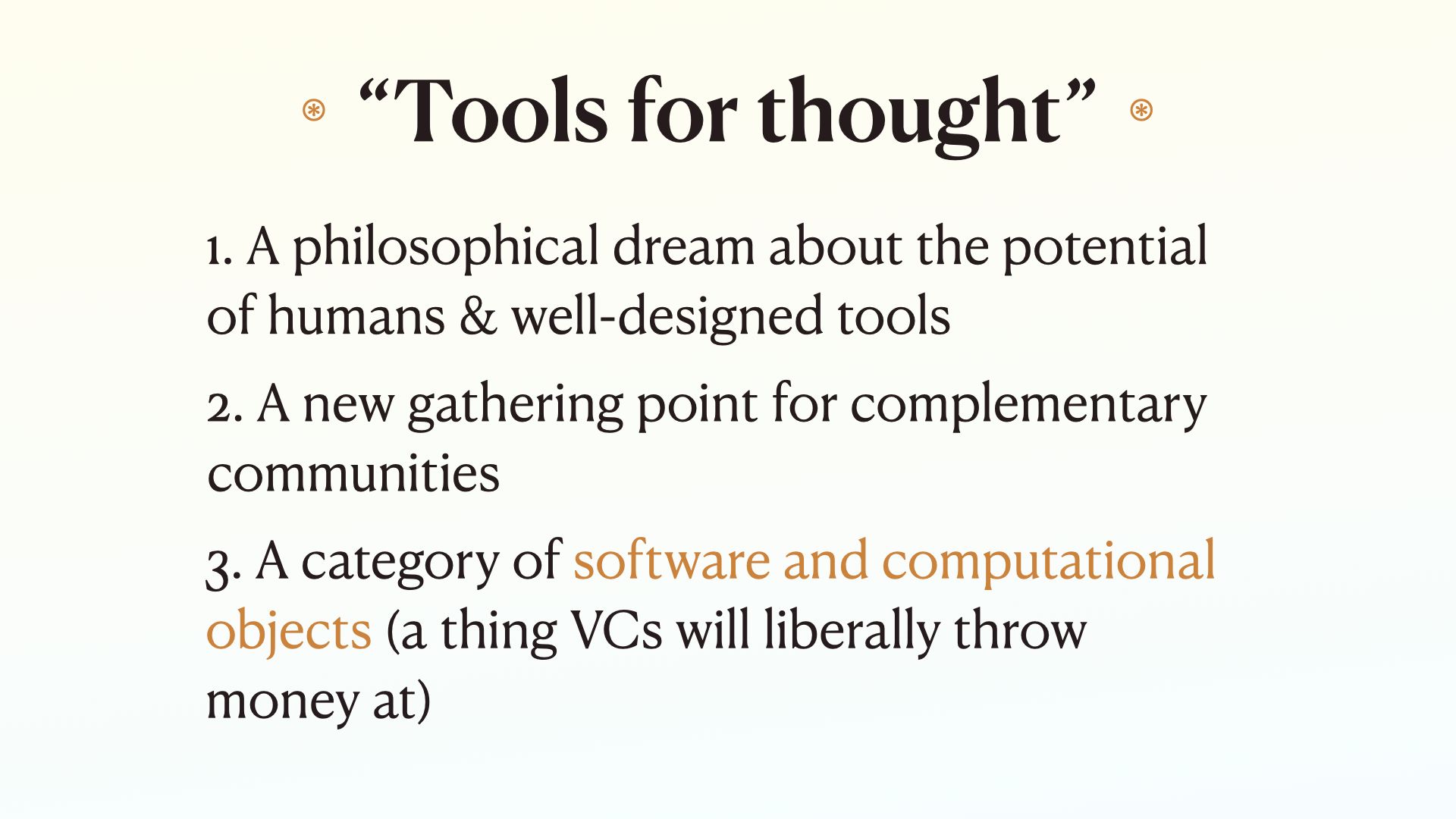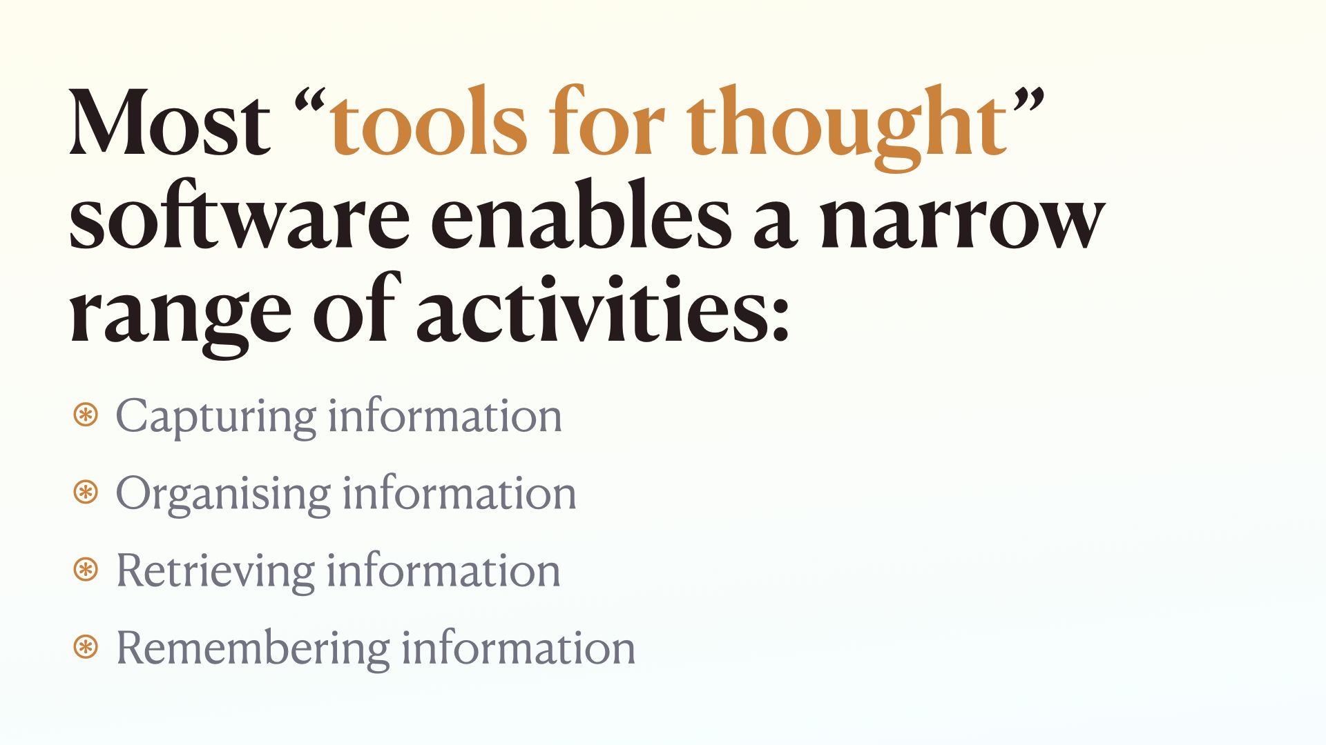 So we’re in an interesting place; all this software is being called tools for thought And most of the community is focused on building more software