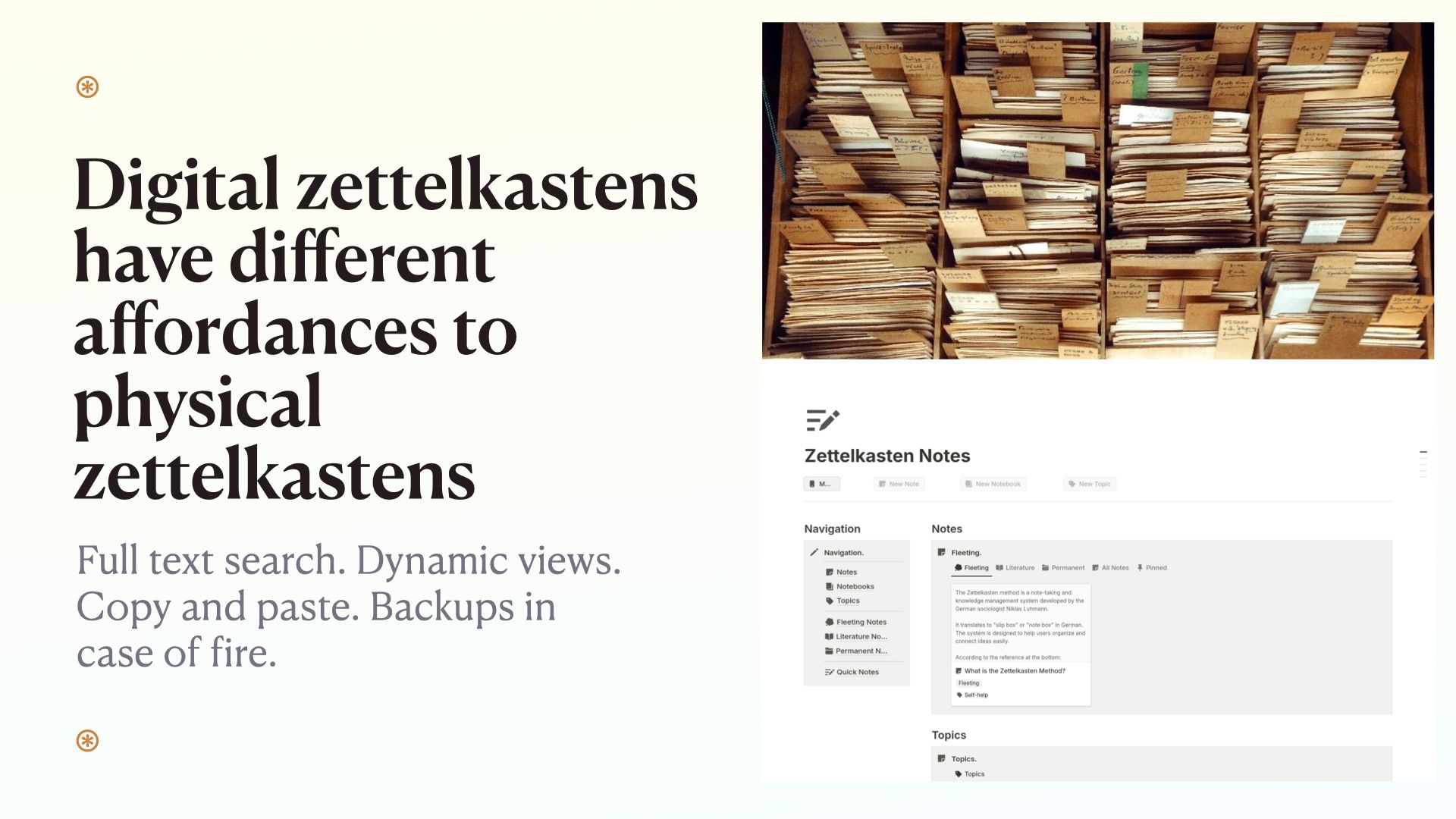 I think it would be slightly absurd to deny the fact a digital zettelkasten or note-taking system has very different affordance to a physical zettelkasten. Even if they’re based on the same cultural practices.