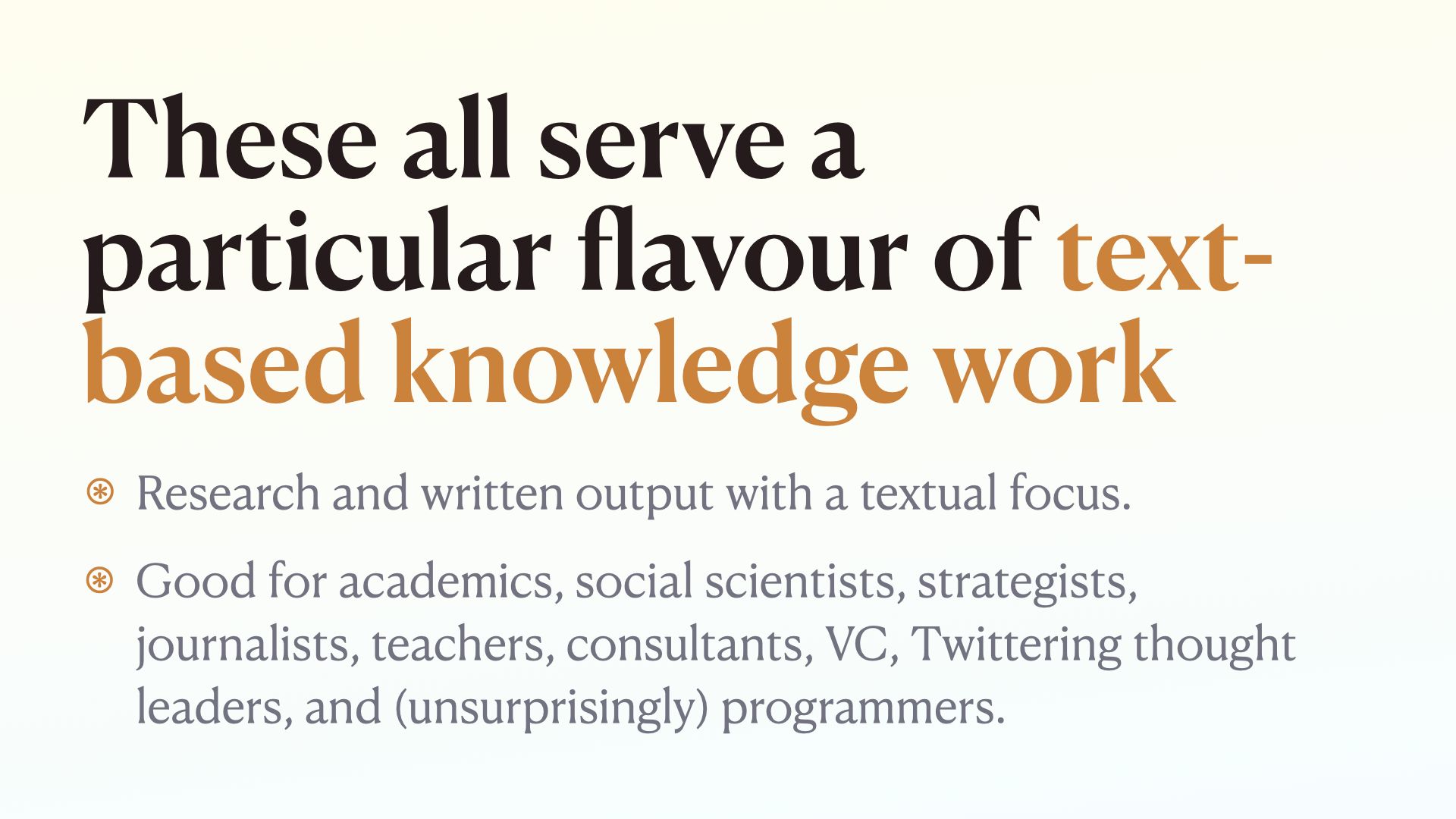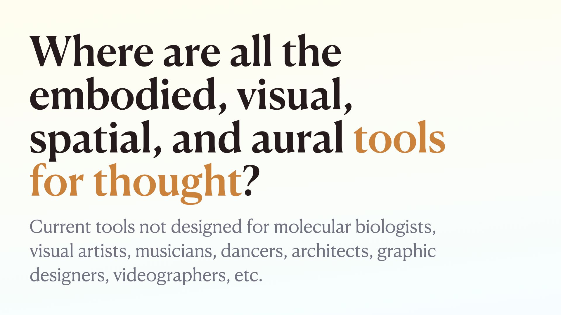 Professions that primarily work in non-textual mediums are unlikely to find the “tools for thought” we’re currently offering as profoundly helpful.