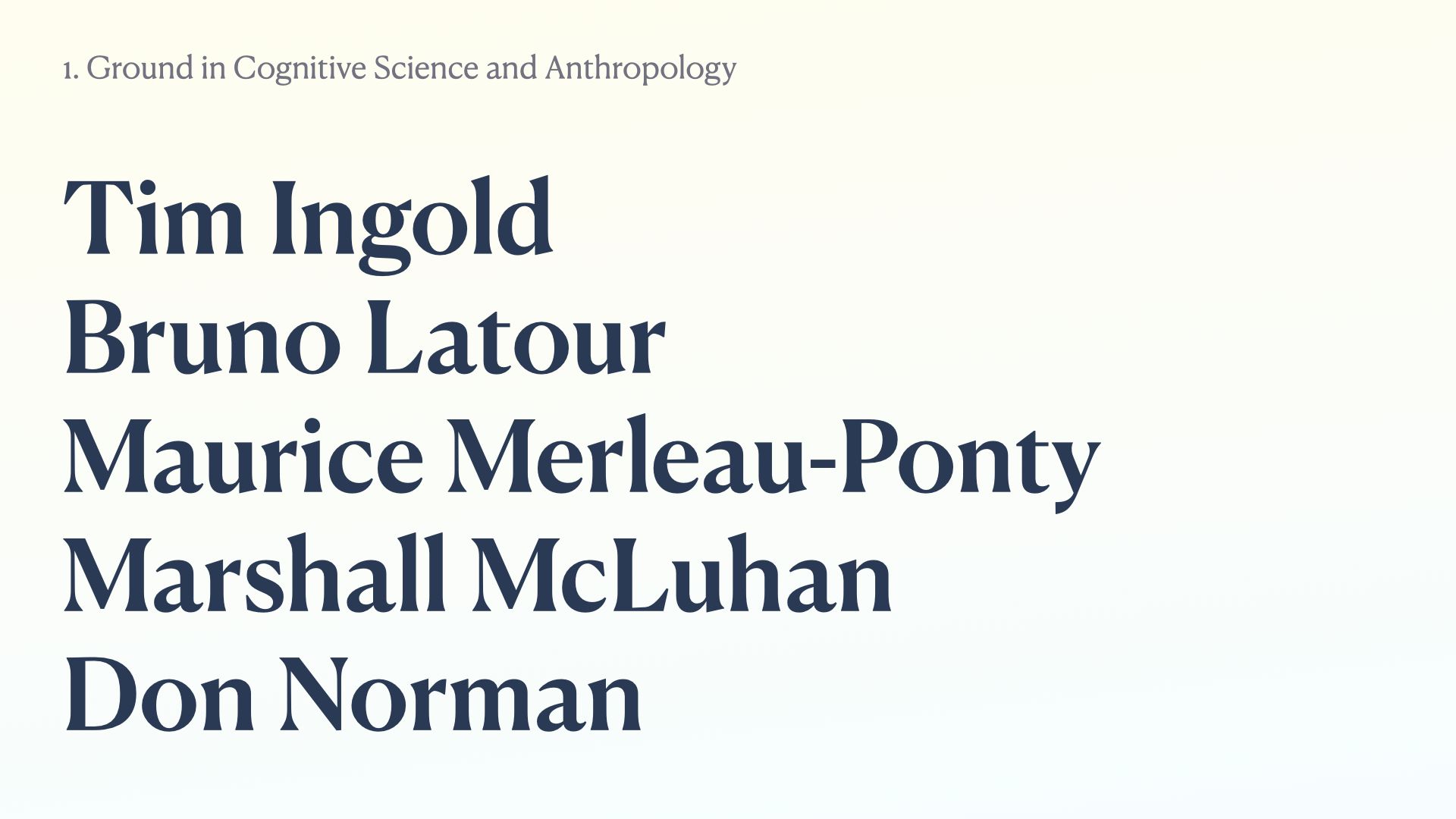 There’s also Bruno Latour, another anthropologist who worked on actor network theory. Maurice Merleau-Ponty, very famous for setting the foundations of embodied cognition. Marshall McLuhan for talking about the relationship between mediums and communication. And I’m sure you all know, Don Norman came up with the idea of cognitive artefacts.