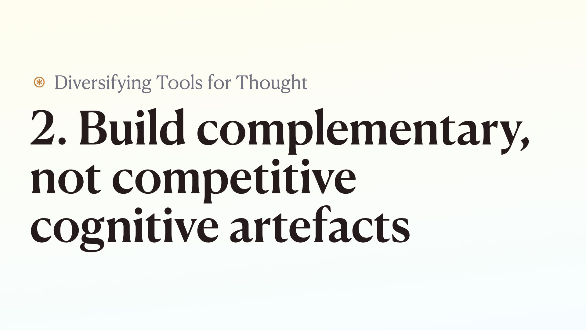 The second way to diversify tools for thought is to build complementary, not competitive artefacts