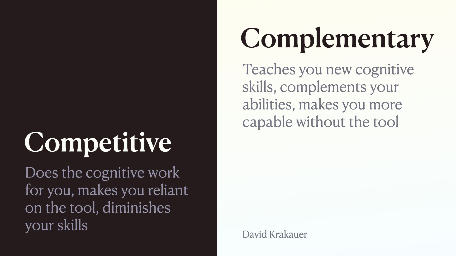 While complementary artefacts teach you new cognitive skills through using the tool. They complement your abilities and they make you more capable even when you don’t have the tool with you.