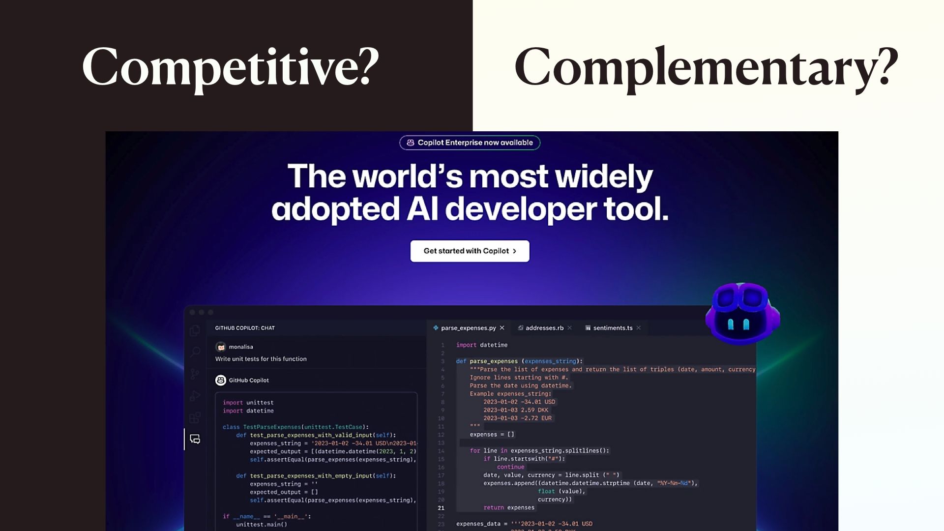 I think used in some ways these could be complementary, but the vast majority of uses I’ve seen of them are actually competitive. They’re not helping you learn how to solve programming problems yourself, especially if you’re not reading the code that they output.