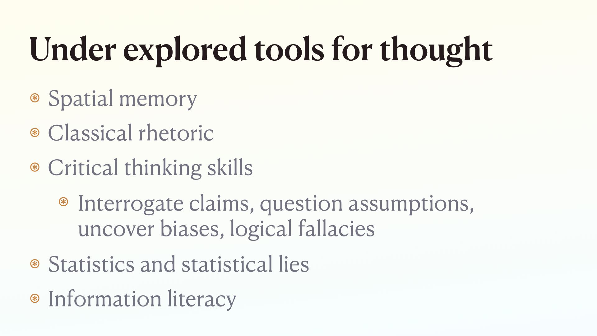 I know a lot of the examples I showed probably fall under the category of critical thinking lenses. But you could also teach people to see through an emotional lens, or see the world through the lens of complexity theory and emergence. To me, these are the most promising “tools for thought.”