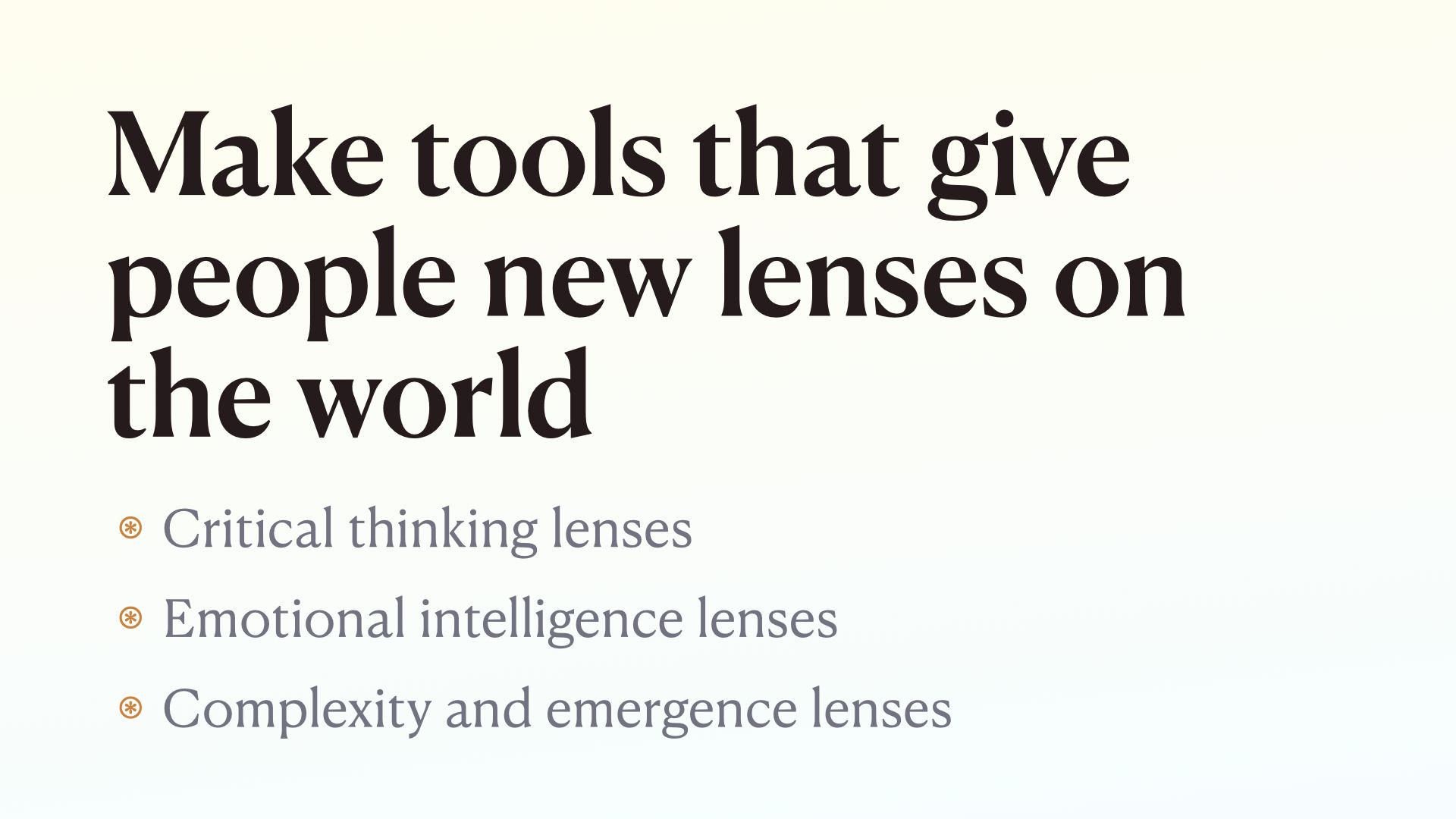 In other words, we should be building tools that give people new lenses on the world. That teach you how to see and think in useful new ways.